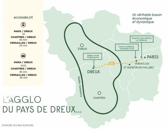 Dreux est une commune d'Eure et Loire située à une heure de Paris environ en train ou en voiture. Dreux bénéficie d'un emplacement privilégié au carrefour de trois régions, l’Île de France, le Centre Val de Loire et la Normandie. L’Agglomération du Pays de Dreux est ainsi située au centre d’un véritable bassin économique et dynamique. La localisation du Domaine des Bas Buissons, un site majestueux, chargé d’Histoire, est donc parfaitement en accord avec les nouveaux modes de vie (télétravail, espaces verts, qualité de vie etc).